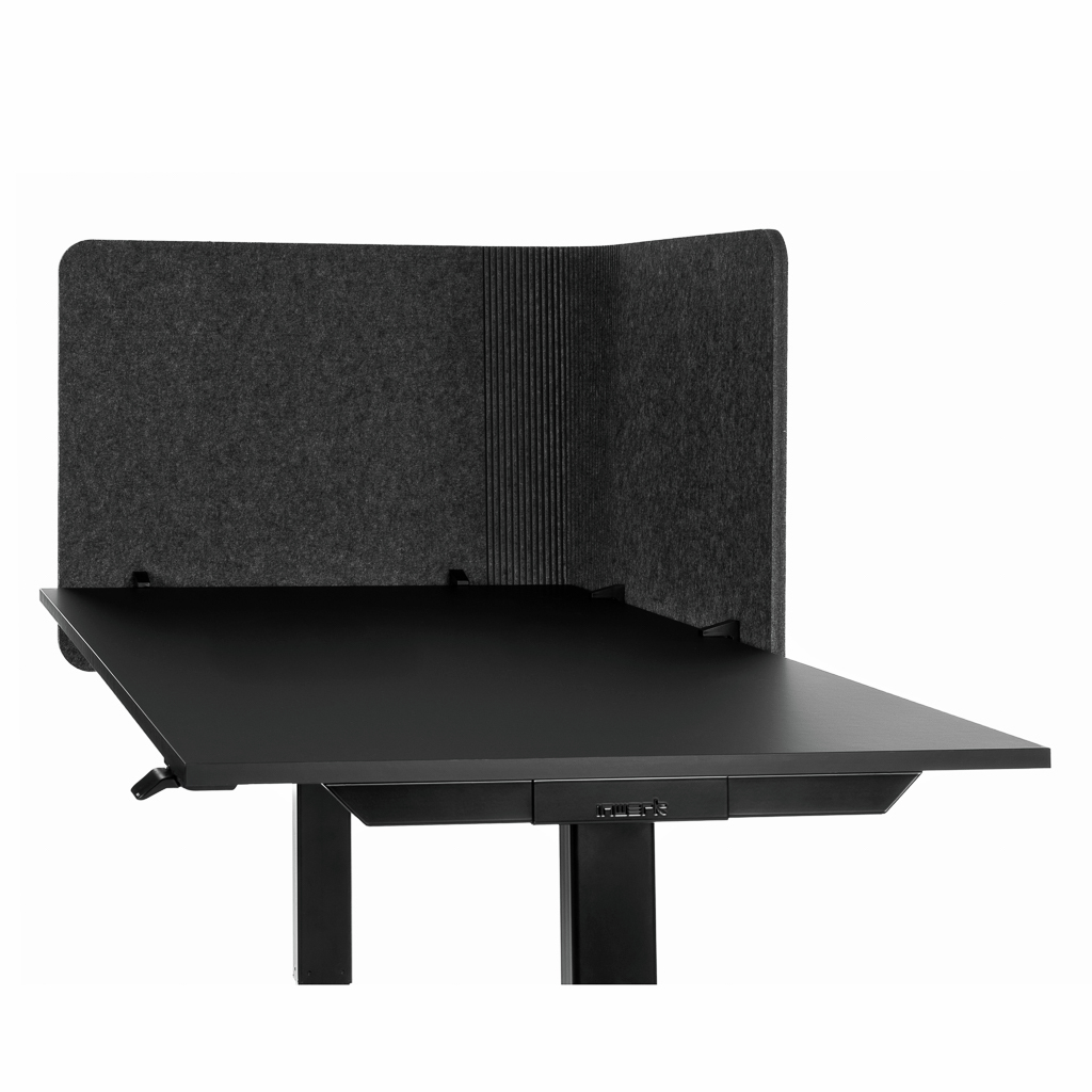 - 2 Tischtrennwände Akustix® flex ergeben eine Schreibtisch-Einhausung in U-Form