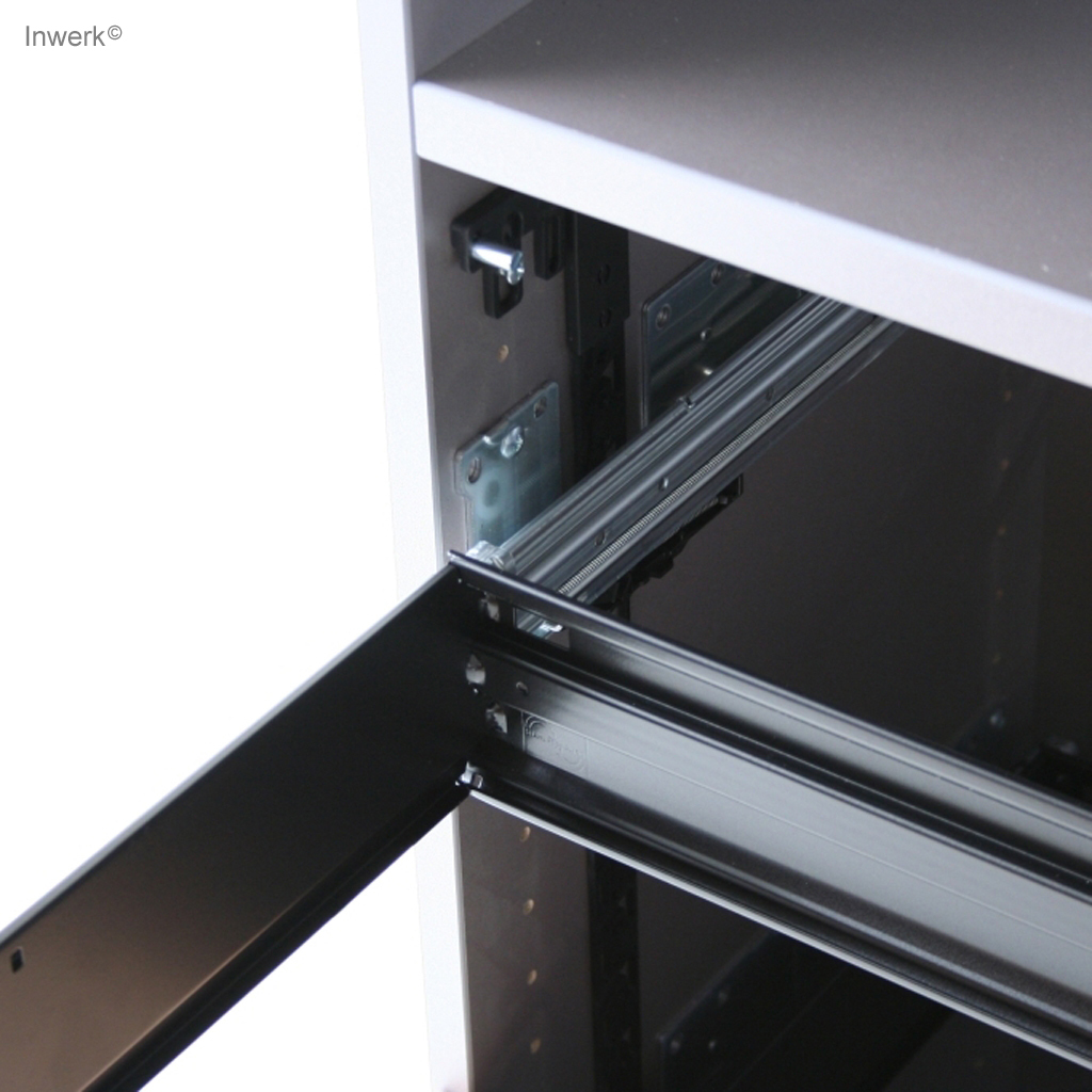 • Rollladen: Flexible Kunststoff-Rollladen, die sich vertikal öffnen (nach oben oder unten rollend) und in einem Rollladenkasten rollen. Sie sparen Platz seitlich und vor dem Schrank.