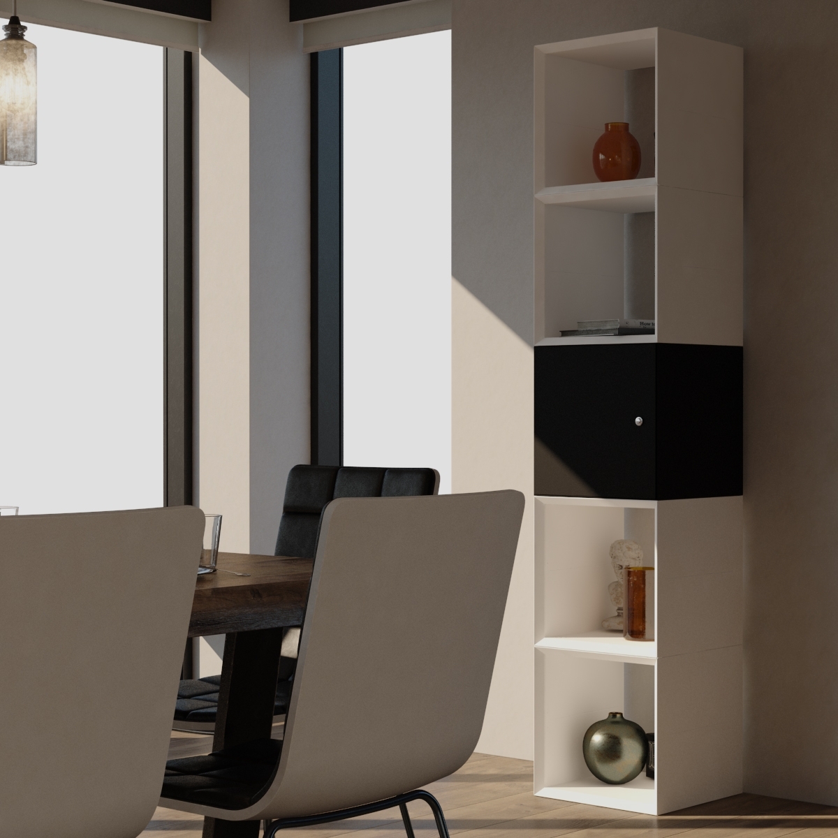 • Rollladen: Flexible Kunststoff-Rollladen, die sich vertikal öffnen (nach oben oder unten rollend) und in einem Rollladenkasten rollen. Sie sparen Platz seitlich und vor dem Schrank.